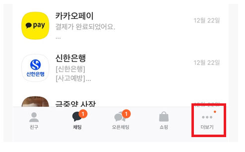 1) 카카오톡 우측 하단의 더보기 버튼을 선택합니다.